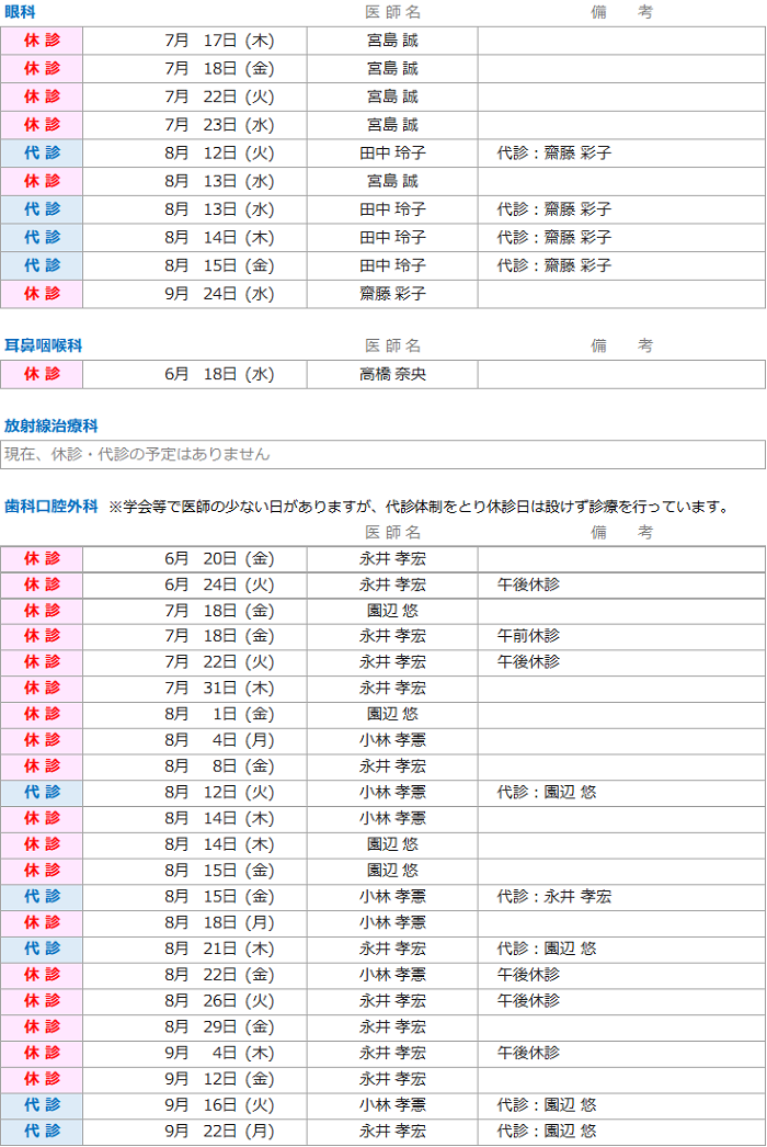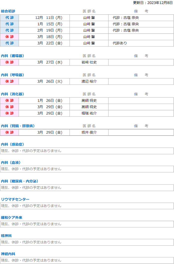 休診・代診のお知らせ 現在予定している各診療科の休診・代診は次のとおりです。下記日程は当日まで変更されることがあります。各診療科窓口でご確認ください。緊急の場合は掲載されないこともございます。予めご了承願います。