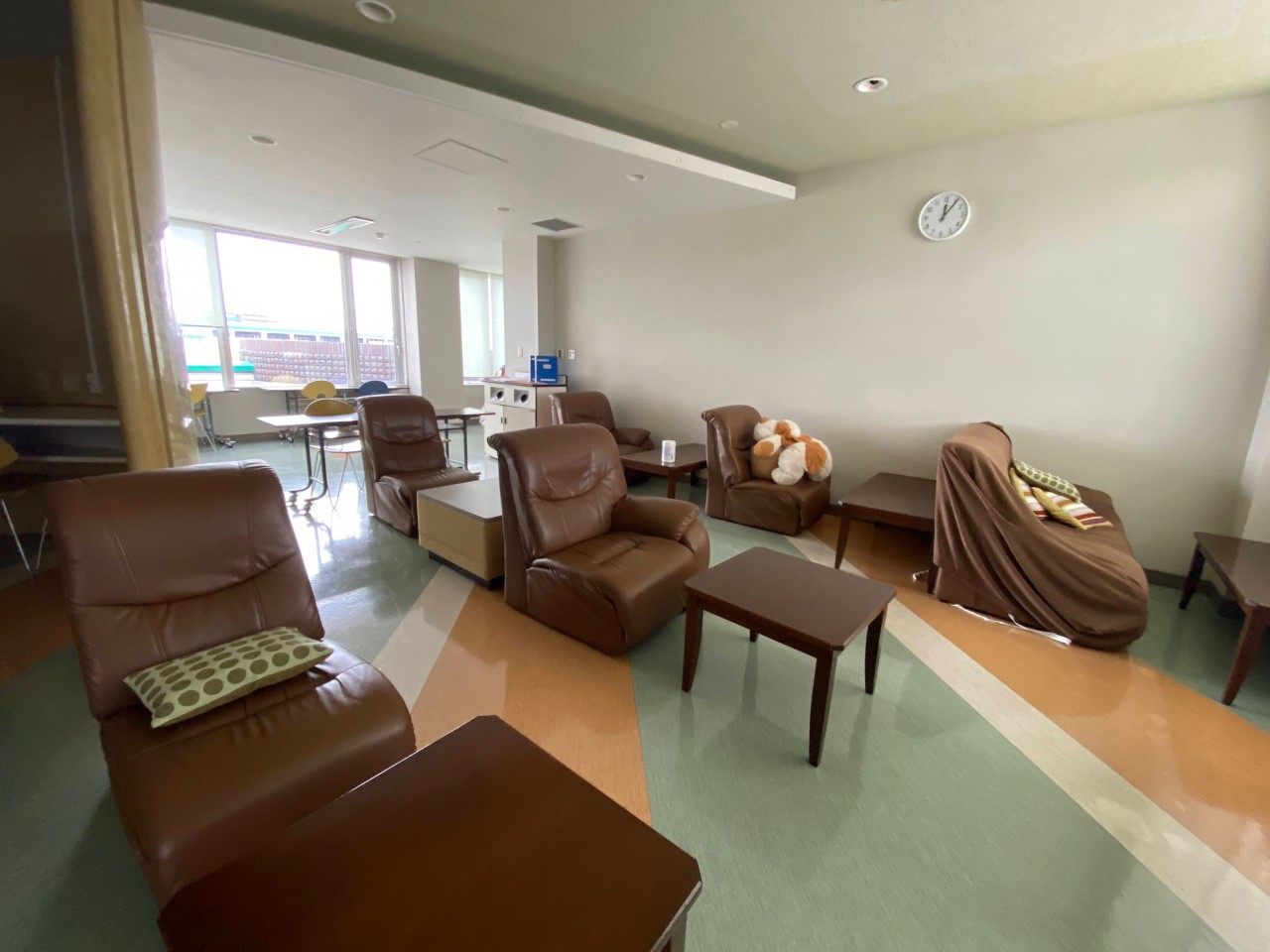 カフェスペース(密を避け孤食ができる空間を学内に作りました!)で感染予防をしながら、