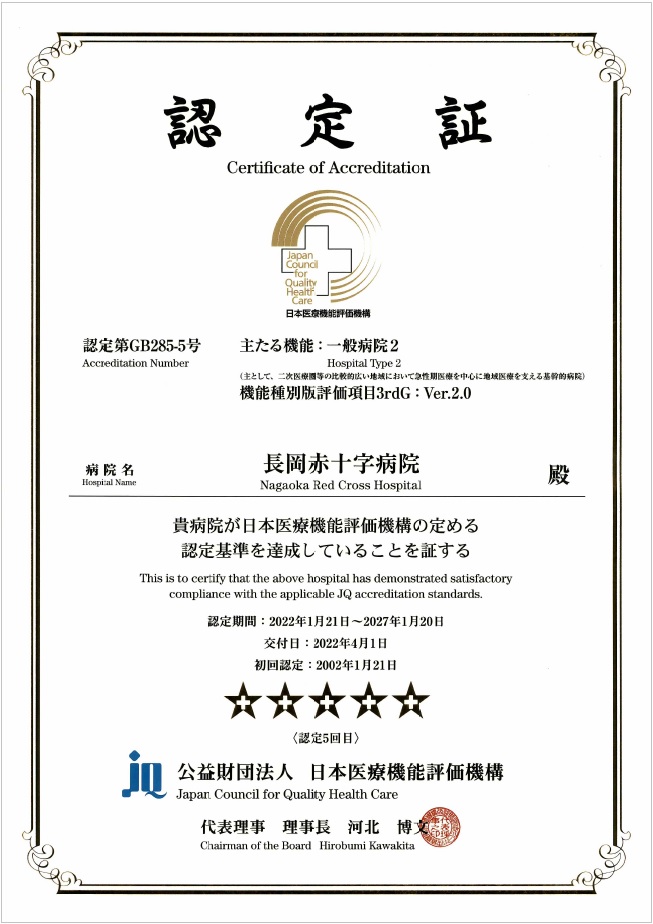 令和4年4月1日に日本医療機能評価機構より病院機能評価3rdG:Ver.2.0の認定をいただきました。